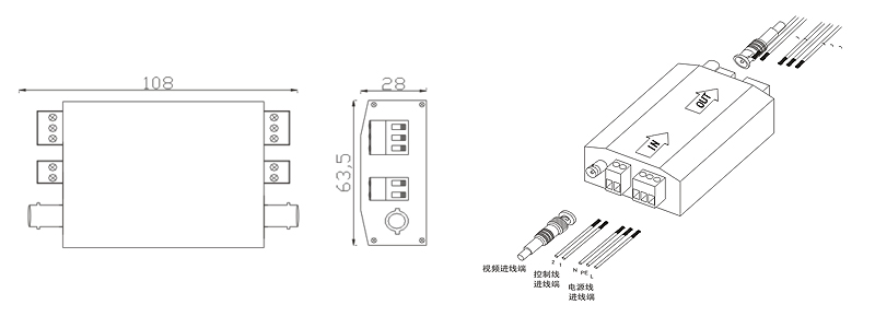 在被保護(hù)設(shè)備的線路接口前端串聯(lián)接入避雷器,“OUT”為設(shè)備端、“IN”為進(jìn)線端,將避雷器接地端與防雷地線(推薦接地電阻≤4Ω)作良好電氣連接。