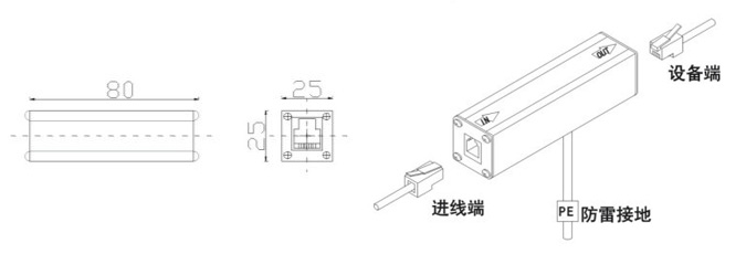 在被保護設備的線路接口前段串聯(lián)接入避雷器,“OUT”為設備端、“IN”為進線端,將避雷器接地端與防雷地線(推薦接地電阻≤4Ω)作良好的電氣連接。
